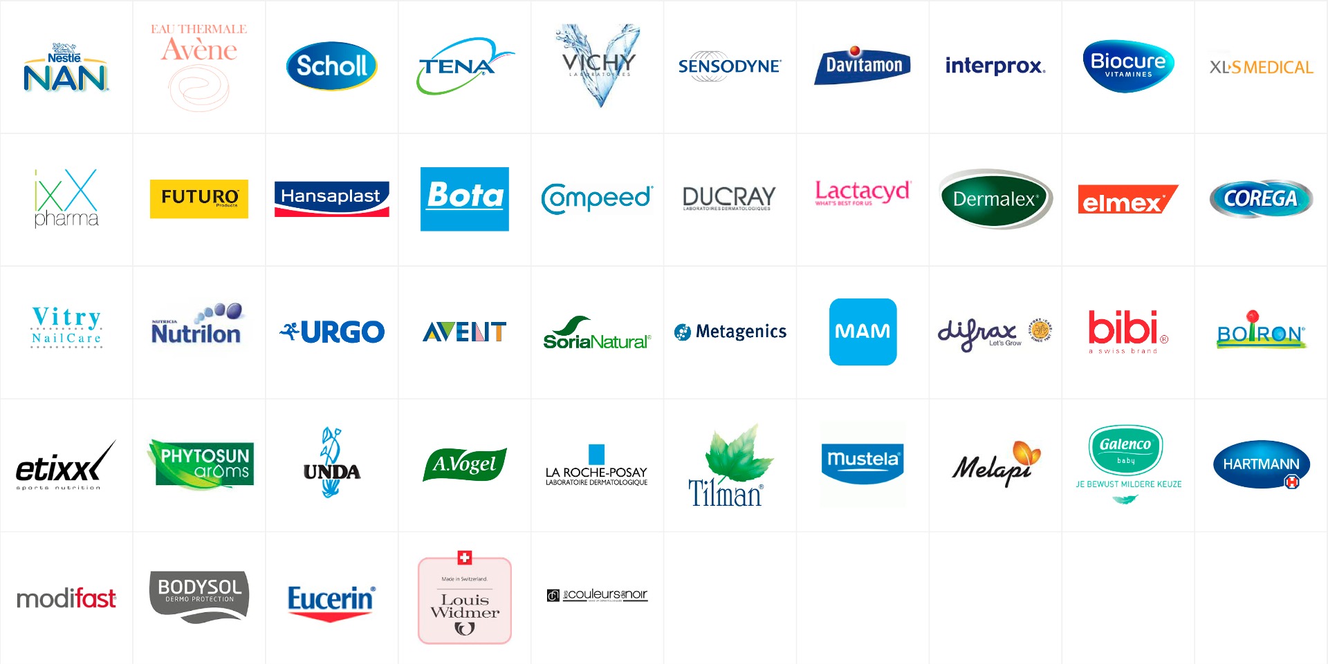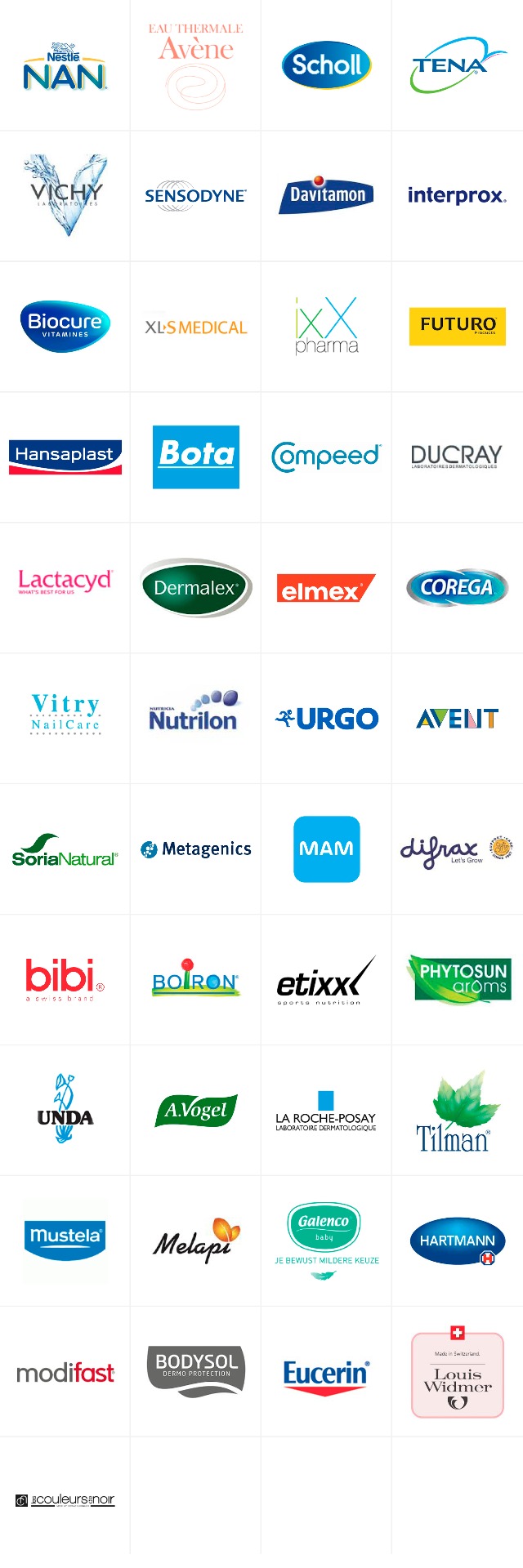 Naast geneesmiddelen kan je bij ons ook terecht voor een uitgebreid assortiment verzorgingsproducten, babyproducten en voedingssupplementen, inclusief raad en advies. Hieronder vind je enkele van de merken die we aanbieden.